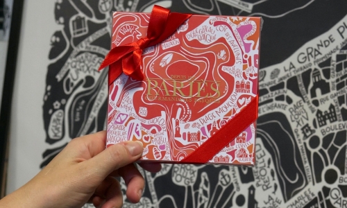 Une palette de couleurs pop pour un plan qui nous fait naviguer à travers les spécialités de notre maison, pour ne pas perdre le Nord de la gourmandise. Une création unique pensée comme un souvenir à conserver, après avoir croqué ces délicats petits coeurs pralinés noisette, enrobés de chocolat noir ou de chocolat au lait.