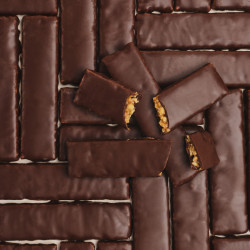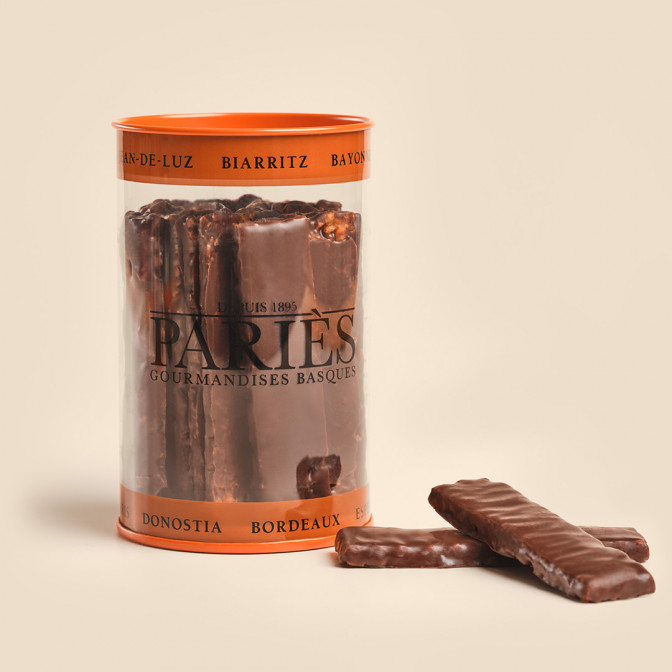 Ingrédients : Noisettes du Piémont (50%), sucre, beurre, sirop de glucose, pâte de cacao 100%, beurre de cacao, émulsifiant : lécithine de soja.