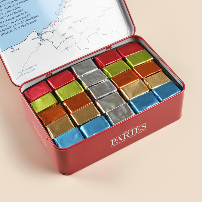 Ingrédients : Sirop de glucose, sucre, beurre, pâte de cacao 100%, stabilisant: sorbitol, crème liquide, noisettes concassées, noix concassées, amandes grillées, beurre de cacao, café, arôme naturel de vanille, piment d'Espelette, sel