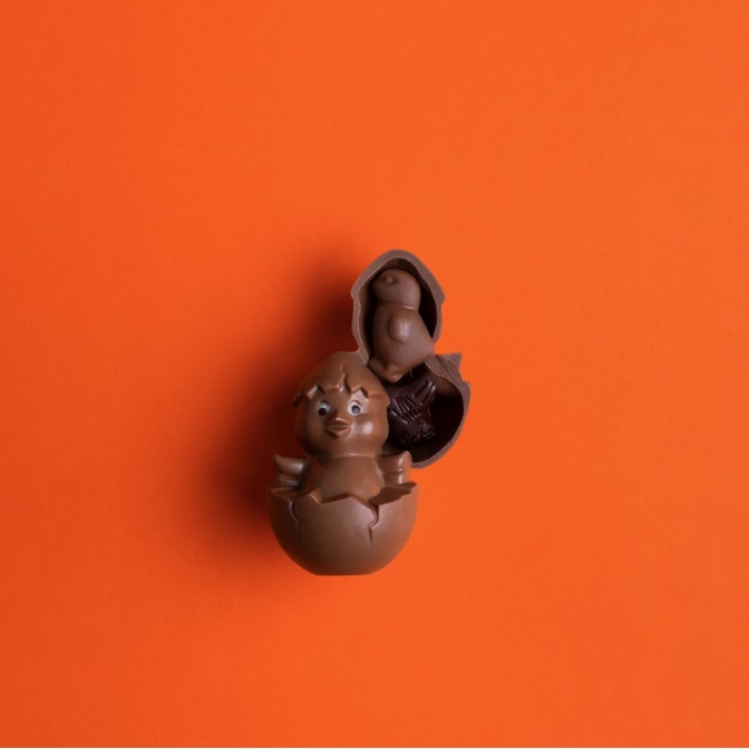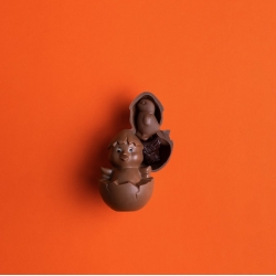Poussin chocolat au lait T1 vide, accompagné de quelques fritures lait et noir, 50g