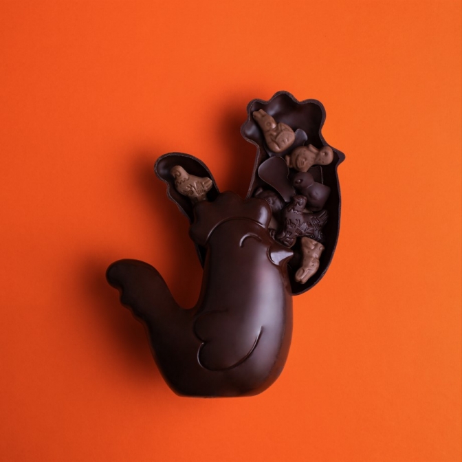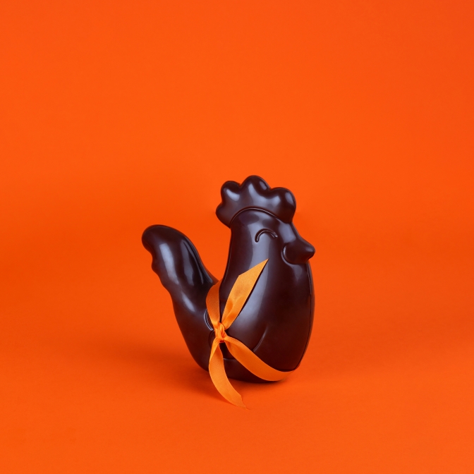 Poule chocolat noir T3 vide, accompagnée de quelques fritures lait et noir, 200g