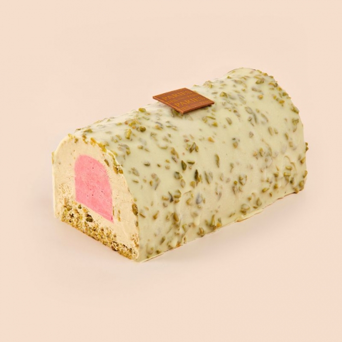 Crème glacée à la pistache de Sicile DOP Bronte, sorbet à la framboise des Landes sur une dacquoise à la pistache.